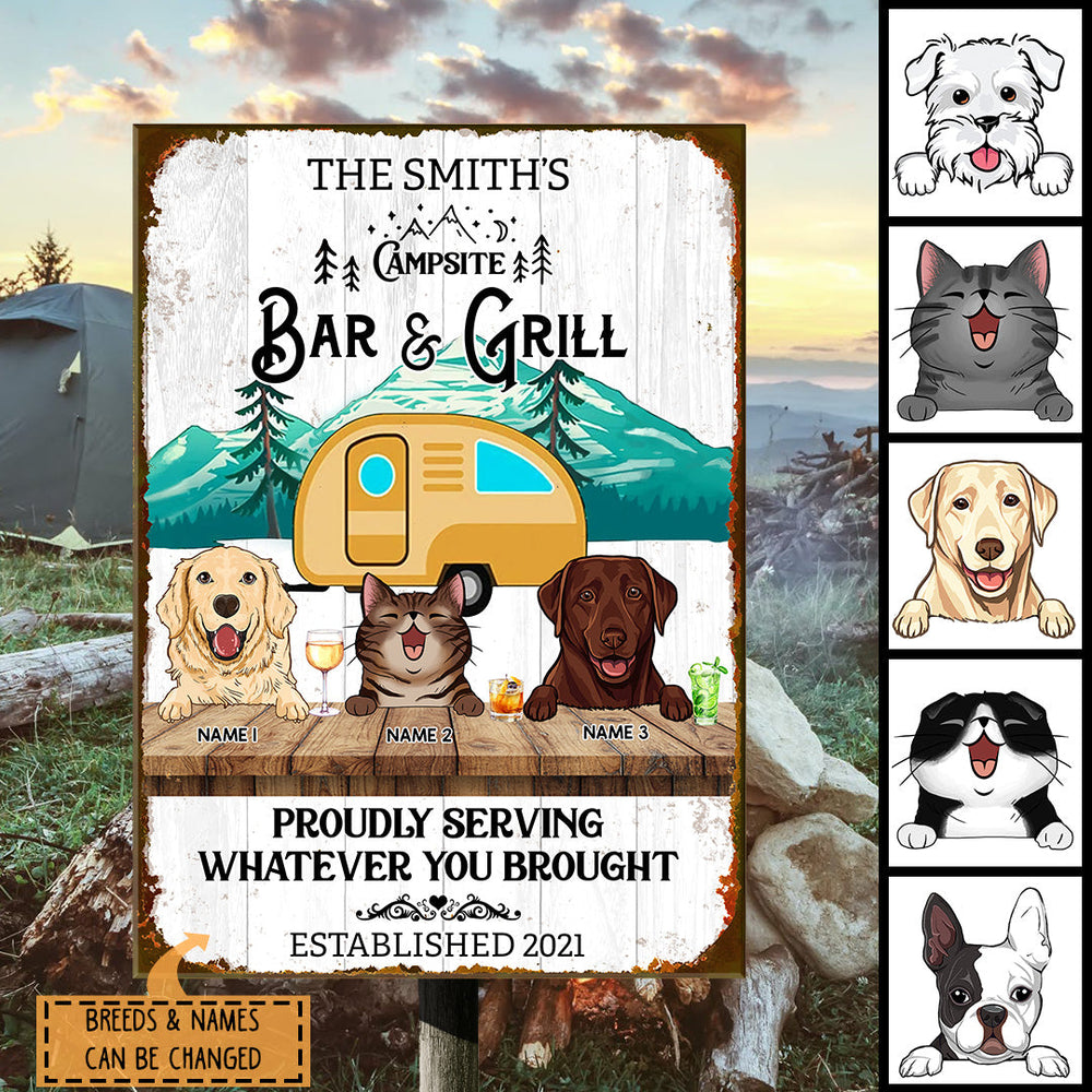 Campsite Bar & Grill Proudly Serving Whatever You Brought, Camping Sign, Personalized Dog & Cat Metal Sign