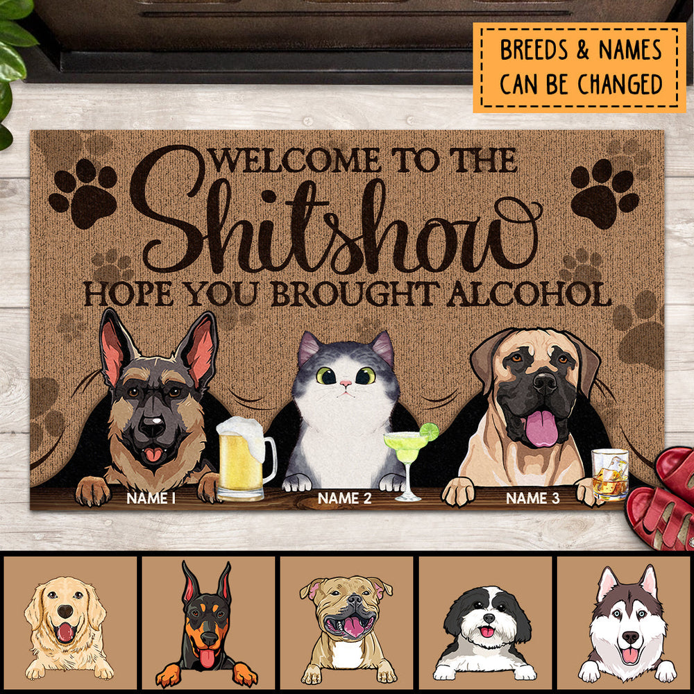 Welcome To The Shitshow Hope You Brought Alcohol, Paws On Brown Curtain Background, Personalized Dog & Cat Breeds Doormat